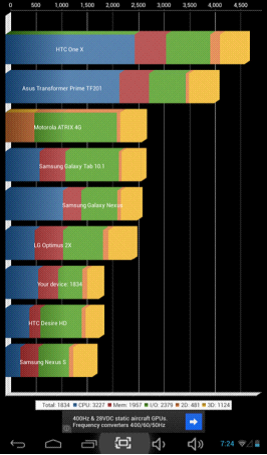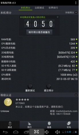 AnTuTu Benchmark是一個專門給Android設備的手機、平板電腦硬體打分的軟件,,通過“內存性能”、“CPU整數性能”,“CPU浮點性能”、“2D、3D繪圖性能”、“數據庫IO”、“SD卡讀、寫速度” 等性能測試對手機的硬體性能做出評分。
