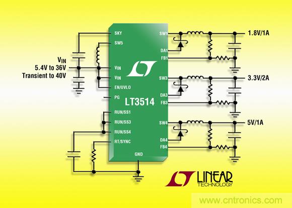 【導讀】淩力爾特推出具100% 占空比操作能力的 36V 輸入電壓、三通道、2A + 1A + 1A (IOUT) 降壓型開關穩壓器LT3514。同時,它具備恒定頻率、堅固的抗短路性能等優勢,非常適用於需要多個輸出的汽車和工業應用。