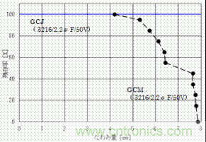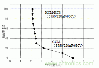 根據這個評價結果,於一般用2端子的MLCC(GCM係列)的殘存率的比較如圖7、圖8所示。GCJ、KCM/KC3係列,電路板的偏轉量在6mm的時候也看不見對陶瓷部分的破壞,於GCM係列相比耐電路板彎曲性有了飛速的改善。