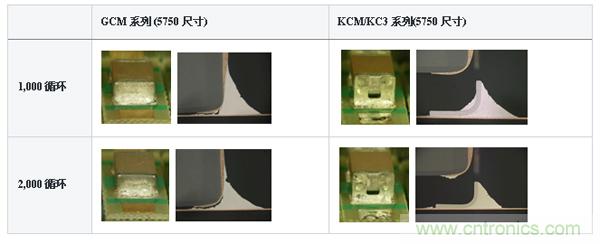 GCM係列的話,在1000°溫度循環的情況下會發生焊接裂縫,而KCM/KC3係列的話即使在2000°溫度循環的時候也看不見焊接裂縫,可見對於熱應力可確保高可靠性。