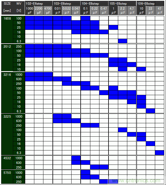 GCJ係列1608-5750尺寸、6.3V-1,000V正在商品化。此外,這裏沒有表示出的150°C高溫環境下使用的產品也在商品化中。