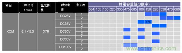 GCJ係列、KCM/KC3係列的125°C對應產品一覽如圖13、圖14、圖15所示。