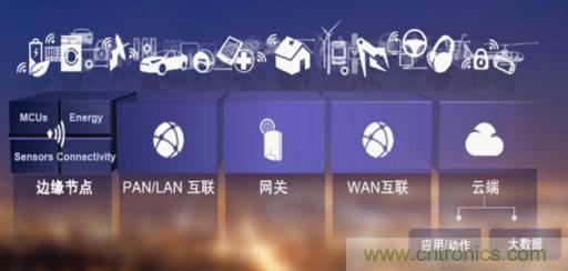 目前,整個物聯網的係統架構可以分為5個部分,分別是邊緣節點、PAN/LAN互聯、網關、WAN互聯和雲端,如圖1所示。飛思卡爾發現,很多公司所做的產品無法在邊緣節點、網關以及雲端這3個層次中共用。例如可穿戴設備,或者所設計的智能家居中的某些節點,要對該節點進行控製,可能選擇方案是“入門級低功耗MCU+連接性+傳感器”,這種設計方式是純粹的MCU設計方式。到了網關層次,複雜度會提高,就更偏向於使用高端的MCU,甚至是MPU。到雲端就更複雜了,它的設計可能采用應用處理器或者通信處理器。在物聯網的構架中,大部分設備使用不同的技術、工具和開發環境,甚至連編程語言也是不同的。怎樣來解決這個問題呢?