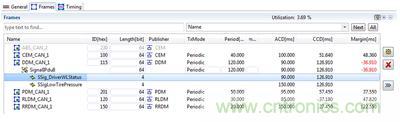 在模擬 CAN 總zong線xian數shu據ju路lu徑jing時shi,需xu要yao考kao慮lv到dao傳chuan輸shu開kai始shi時shi的de不bu確que定ding性xing。可ke能neng出chu現xian的de情qing況kuang是shi,更geng高gao優you先xian級ji的de信xin息xi占zhan用yong數shu據ju總zong線xian,從cong而er造zao成cheng傳chuan輸shu延yan遲chi。因yin此ci要yao找zhao出chu造zao成cheng延yan遲chi變bian化hua的de抖dou動dong因yin素su -- 通常要提前知道有多少優先級較高的信號可能在總線上,這樣可以盡可能精確預測抖動因素。通過這些參數和進行自動化設計規則檢查 (DRC),從第(3)步到第(7)步的最大延遲為74.5毫秒,這樣的設計檢查可以通過。這是“最壞情況”的測試,設計人員要相信路徑延遲永遠不會比這更糟,實際上會好很多。