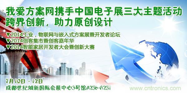 【導讀】我愛方案網和CNT Networks攜手中國電子展主辦的“2014工業、物聯網和嵌入式設計方案展暨中國西部電子開發者與創客論壇”即將於2014年7月10日-12日在成都開幕。同期同地,我愛方案網還將舉辦2014創客集市暨創客嘉年華活動,以及與千家網合辦2014智能家居開發者論壇暨創新大賽(成都)。