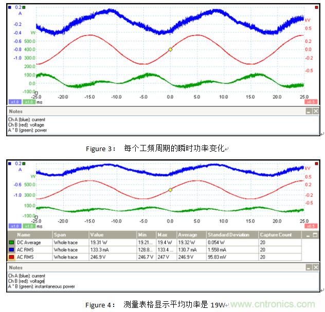 PR=19.32W,視在功率PA也是很容易計算的。它是由產品電流和電壓的RMS值來計算的。PA=0.1307A×246.9V≈32.27 W