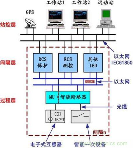 IEC 61850 標準是變電站自動化領域最為完善的通信標準,該標準將變電站自動化係統分為三個層次,即站控層、間隔層、過程層。站控層包括監控主機、操作員工作站、遠動工作站、工程師工作站、GPS對時裝置等,形成全站監控管理中心。間隔層包括繼電保護裝置、測控裝置等二次設備。過程層包括變壓器、斷路器、隔離開關、互感器等一次設備及其所屬的智能組件。如圖1-1所示。