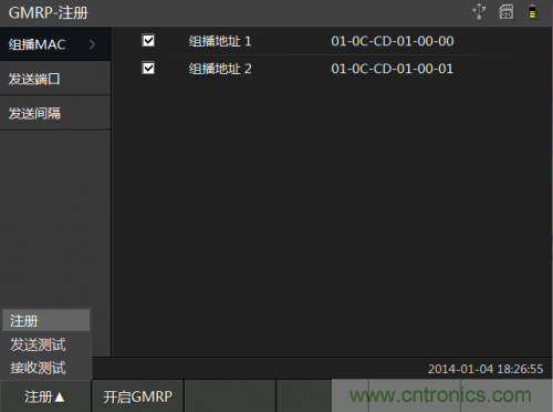 GMRP模塊在DT6000E設備總共分為注冊、發送測試和接收測試頁麵。