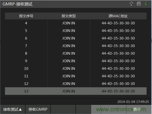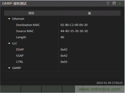 接收測試頁麵用於接收來自其他設備發送的GMRP報文。界麵枚舉出報文類型,以及組播地址。並且對報文內容也可以做到解析。如圖 1-4所示: