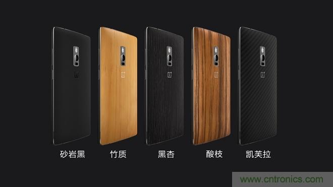 外觀上一加2以1代產品為基礎,在手感、質感上兩個詞上下功夫。新機采用金屬材質邊框,並調整邊框背麵弧度使之更貼合;材質方麵,新品擁有砂岩黑、竹質、黑杏、酸枝、凱芙拉共計五種後殼版本。盡顯複古,原始,典雅風格。側麵金屬的加入和可更換後殼,讓手感做出提升和差異化。
