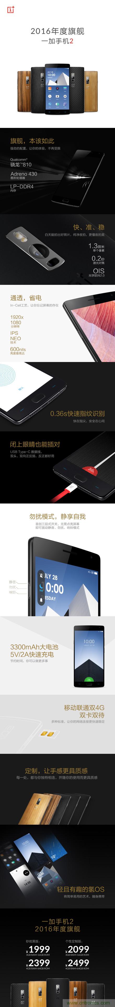 整體硬件上,一加二代擁有5.5寸1080P分辨率屏幕;采用新版驍龍810處理器+3GB RAM+16GB ROM基本硬件組合(高配版采用5.5寸2K屏幕+驍龍810+4GB RAM+32GB ROM);配備後置OIS光學防抖+激光對焦1300萬像素主鏡頭和500萬像素前置鏡頭;新加入前置指紋識別,支持最快0.36s解鎖;選用雙麵可插拔 USB Type-C接口;內置3300毫安時鋰電池,支持移動聯通雙卡雙4G。