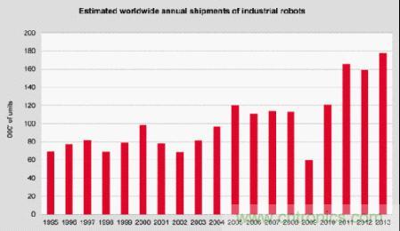 根據國際機器人聯盟(IFR)2014年統計顯示,2013年機器人出貨量增長12%,成長至178,132台,如圖1所示,工業機器人持續在汽車、化工、橡膠、塑料等行業以及食品行業增加;2008年至2013年,中國的工業機器人每年總供應量平均增加36%,並且可促使該國成為世界最大的機器人市場。