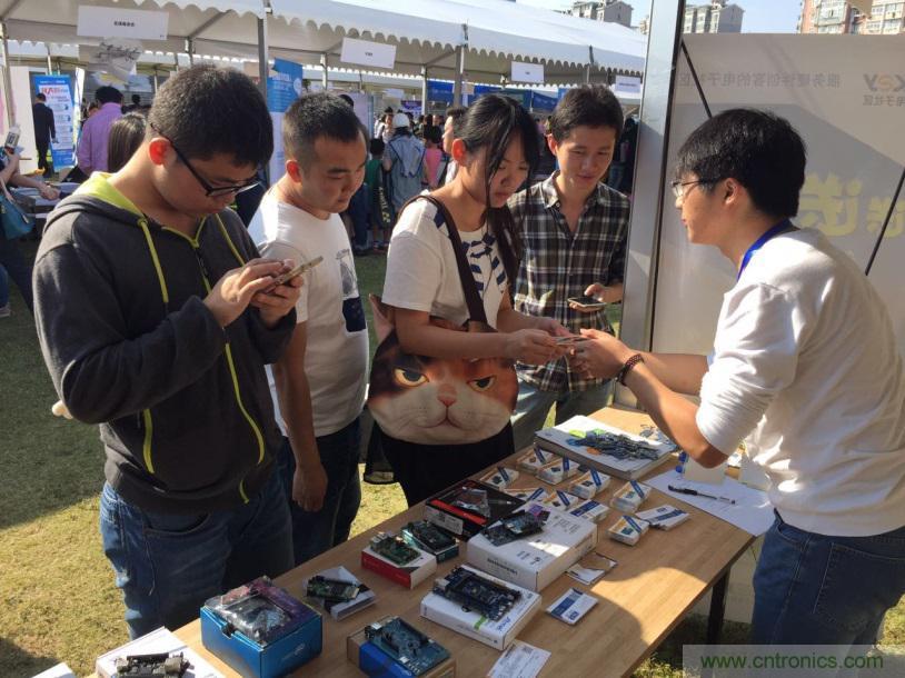 雲漢電子社區工作人員向參觀者展示開發板