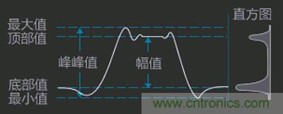 2.自動測量,當示波器正確捕獲波形後,示波器可以對波形參數進行自動測量。自動測量需要參考點,一般稱為Vtop(頂部值) 和Vbase(底部值),參考點的測量采用幅度統計方法。示波器的工作過程是對捕獲波形進行的幅度分析,先確定最大值Max和最小值Min,然後對最小電壓上的40%和最大電壓下的40%進行分析,然後進行累積概率統計,出現概率最大的值為Vtop 和Vbase。不用統計中間20%部分,防止被測波形是3態信號得出錯誤結果。