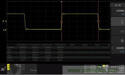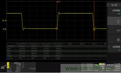 為什麼會出現這種情況呢?示波器自動測量的門限是為Vtop與Vbase之間50%的位置,所以測量的結果也是以50%處為準,這種測量方法也更為科學。在用光標測量時,如果將測量點選在Vtop與Vbase的50%處,這樣測出的結果便和自動測量結果相差無幾了。如下圖,光標測量470ns,自動測量470.1ns。
