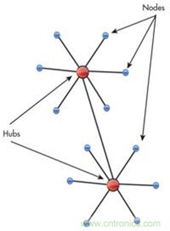 在網路術語中,所有連接到網路的設備都被分類為網路節點。在最基本的網路結構中,各節點通過集線器連接在一起。即多埠設備將任何到達的資訊包複製到與之連接的所有其他埠(節點)(圖1)。