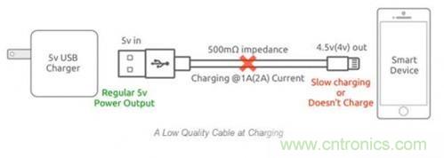 還拿上麵那個例子來解釋,在2A充電電流下,會產生1V的電壓降,設備端充電電壓僅為4V。除了可能會帶來安全性問題之外,對智能設備而言,這麼低的電壓甚至無法對設備充電。