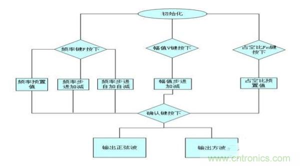 單片機控製AD9851產生頻率和相位都可控的正弦波,頻率量由鍵盤設定,步進量為5Hz,AD9851頻率分辨率為0.006985Hz,完全能夠滿足要求。正弦信號送入DAC8831的基準輸入端,單片機控製DA的數字量調節其幅值,設置按鍵調整幅值可實現100mv的步進。在單片機的控製下編程在FPGA內部產生占空比可調的脈衝波,單片機向FPGA送入占空比值和頻率值,FPGA通過計數值從而改變輸出脈衝波的占空比和頻率,設置按鍵調整占空比和幅值。正弦信號送入DAC8831的基準輸入端,單片機控製DA的數字量調節其幅值,設置按鍵調整幅值可實現100mv的步進。