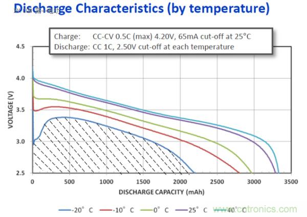 容量測試Output:溫度與容量(能量)關係表。以時間T為X軸,以電壓V為Y軸。不同溫度下1C放電截止在X軸上的點為容量與溫度的關係。而各個放電曲線與X、Y軸形成的麵積之比就是不同溫度下的可用能量之比。如下圖所示:-20℃時的電池可用能量(Wh) = 陰影部分的麵積S。由此可見,SOE比SOC能更加準確的表示出剩餘的能量,從而更準確的評估剩餘裏程。