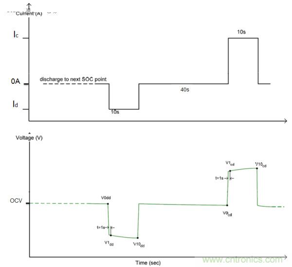 HPPC測試可測得電池的功率性能,開路電壓,直流內阻等重要特性。HPPC測試製度是在某特定SOC目標進行10s脈衝放電,靜置40s,再10s脈衝充電。由此可測得該SOC點充電和放電方向的DCIR。需要注意的是在不同的測試方法下計算的DCIR會存在一定的差異。