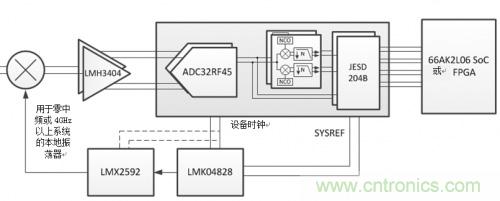 在射頻采樣無線電中,采樣時鍾的質量好壞對係統產生的信噪比(SNR)具有強烈影響。LMK04828是兼容JESD204B的超低噪音時鍾抖動清除器,可生成小於100fs抖動、具有射頻采樣能力的時鍾,同時具有一係列收縮或簡化係統的特性。因支持最多七個JESD204B裝置,LMK04828可以為多個ADC32RF45 ADC、數字模擬轉換器(DAC)、FPGA或DSP記時。LMK04828還可以生成係統參考(SYSREF)信號,用於JESD204B係統中確定性延遲,而數字和模擬延遲可幫助滿足每個JESD204B設備的關鍵計時需求。