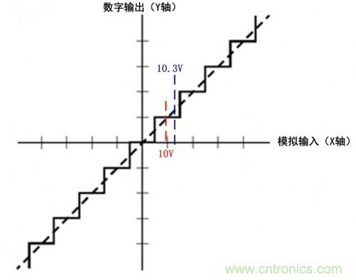 出現這種情況的原因首先是由測量設備內部的ADC產生的量化誤差引起的,假設測量設備內部包含一個11位的ADC,ADC共有211=2048個有效位,在1000V的量程(峰峰值)下,考慮最大±1000V的輸入共2048個有效位,則由於不可避免的噪聲的影響,ADC每跳動一個最小單位1LSB,產生的量化誤差大約會有2000V/2048≈1V。如果使用該量程測量10.3V這樣的信號,很顯然單次ADC取樣的最小分辨率已無法識別0.3V這樣刻度(在圖 2的量化示意圖中0.3V處在兩個刻度中間),當然無法測得正確的值。如果無規則噪聲的峰值能大於1LSB時,多次采樣取平均值後可以提高測量係統的有效位數,但這樣的因素不在我們考慮的範圍之內。