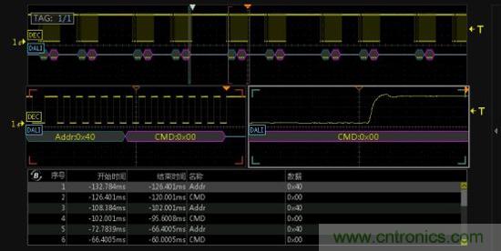 對長時間監測的數據進行異常分析,可在示波器的縮放模式下使用雙ZOOM多(duo)窗(chuang)口(kou)顯(xian)示(shi)的(de)功(gong)能(neng),對(dui)信(xin)號(hao)進(jin)行(xing)多(duo)窗(chuang)口(kou)異(yi)常(chang)監(jian)測(ce)和(he)分(fen)析(xi),可(ke)同(tong)時(shi)對(dui)任(ren)一(yi)數(shu)據(ju)幀(zhen)和(he)數(shu)椐(ju)幀(zhen)上(shang)升(sheng)沿(yan)或(huo)下(xia)降(jiang)沿(yan)細(xi)節(jie)進(jin)行(xing)分(fen)析(xi),然(ran)後(hou)通(tong)過(guo)查(zha)看(kan)放(fang)大(da)數(shu)椐(ju)細(xi)節(jie),事(shi)件(jian)表(biao)中(zhong)的(de)數(shu)據(ju)和(he)波(bo)形(xing)一(yi)一(yi)對(dui)應(ying),定(ding)位(wei)異(yi)常(chang)非(fei)常(chang)方(fang)便(bian),如(ru)下(xia)圖(tu)7所示。