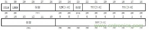 簡單的了解了CAN總線位時間的分段後,我們來看看一個節點的波特率到底要如何設置。如圖2是某ARM內核的CAN位時間特性寄存器 (CAN_BTR)。