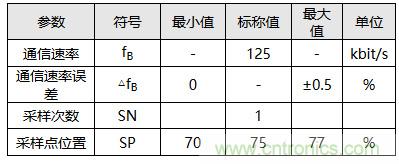 例如某著名車廠CAN通信標準裏規定,通信速率為125 kbps時,應該采用單次采樣,采樣點位置設置在70%~77%之間。其位定時參數取值可見表1與表2。
