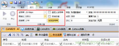 根據上麵提到的原則,我們選取采樣點為75%,SJW為4,時間份額為14的一組參數,采用ZLG的CAN卡做驗證。