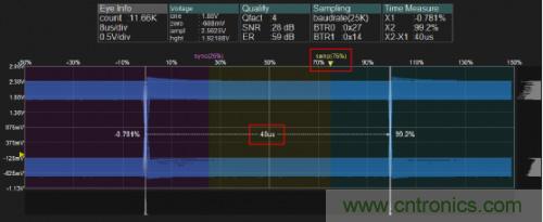 l位時間測試:用CANScope的眼圖功能對當前波特率下CAN卡進行位時間測試,位時間為40us,與25kbps波特率的位時間相符。