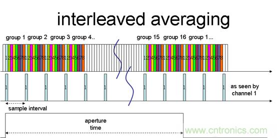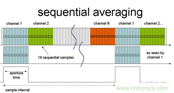 針對這一難題的解決方案交叉平均法則有效得多(見圖2)。定序器與之前一樣圍繞輸入通道,但這一次僅對每個通道采集一個樣本。在通道經過N次單次采樣後,可以讀出所有累積寄存器的輸出。