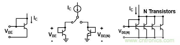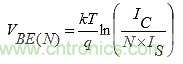 公式(2)顯示了許多並聯晶體管的基極-發射極的VBE(N)值。