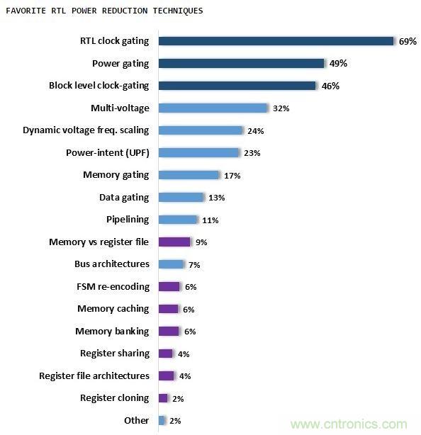 除了上述這些方法,高效的低功耗技術還有許多,比如襯底反偏(加反向電壓降低襯底漏電),多閾值單元(Multi-Vth cell)等等設計方法。下圖是一些比較熱門的RTL級低功耗技術。
