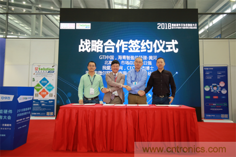 在開啟技術方案平台+供應鏈創新模式的同時,我愛方案網與美國GTI戰略合作簽約儀式也成功舉行,邀請到GTI中國海青智盈總經理黃河先生,北高智市場總監朱仝日強,我愛方案網CEO劉傑博士,深圳市微爾聯科技總經理溫曉標出席。這也是2017年末AI應用聯盟活動的落地,我愛方案網作為GTI芯片方案服務商,攜手第一批代理商北高智、方案開發公司微爾聯,聯合將GTI芯片逐步推向終端市場。