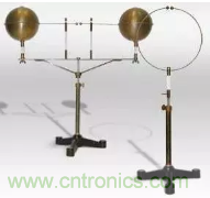 赫茲將兩個大的銅球作為電容,並通過銅棒連接在相隔很近的兩個小銅球上。兩個小銅球連出兩根導線,接到一個感應線圈和一個電源之上。