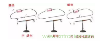 上圖展示了電流的磁效應,導線通電之後,周圍產生的磁場使磁針發生了偏轉。