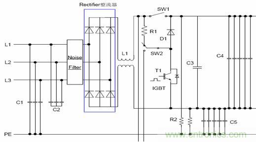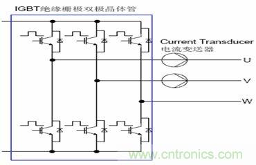 電源係統是指將輸入係統的動力電源轉換成用於驅動交流電機的直流或交流電源,根據實際控製方式的不同,一般可以分為“交直交”電壓源型逆變電路,“交直交”電流源型逆變電路,“交交”型變頻電路以及泵電源電路等。圖1是“交直交”電壓源型電源係統的典型電路,如果將並聯的濾波電容去掉,在直流側串聯一個大濾波電感則為“交直交”電流源型電路。