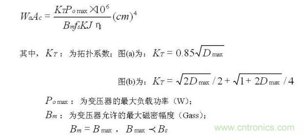 從麵積積公式可知,副邊有續流二極管的變壓器,其拓撲係數小一些,如對於Dmax=0.45,KT(a)=0.57,KT(b)=0.58