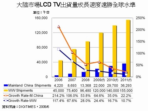 中國大陸LCD TV出貨增長速度遠高於全球平均水平(資料來源:DIGITIMES Research,2009年6月)
