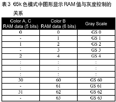在65K色模式,情形有些不同。如表3所示,從GS0到GS63的64階灰度,有一顏色(顏色B)由6bit組成;而從GS0,GS2,.....到GS62,另外兩個顏色(顏色A和C)隻有5-bit,隻能呈現32階灰度。