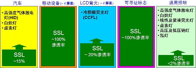 如今,在屏幕尺寸小於4英寸的手機、相機閃光等移動設備應用中,及路邊及體育場中大型顯示屏應用中,LED照明,或稱固態照明(SSL),幾乎占據了100%的份額。除此之外,LED照明也向其它領域邁進。如在汽車應用中,LED照明占據約15%的份額。而在較大液晶顯示屏(LCD)背光應用中,雖然冷陰極熒光燈(CCFL)如今仍然占據主導地位,但LED照明的總滲透率也達到約20%,參見圖1。特別是在備受矚目的大尺寸液晶電視背光應用中,據Laurent Jenck指出,預計LED背光的液晶電視在未來3到4年間,將占據至50%的份額。