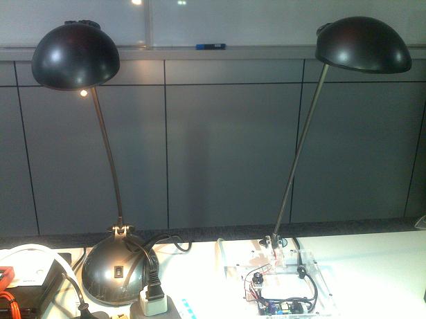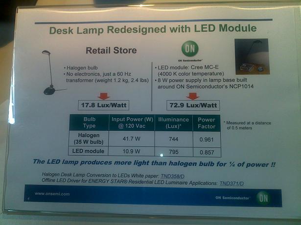 現場,Laurent為我們演示了用LED模塊代替鹵素台燈在能效方麵的差異,如下圖所示:可以看出,使用LED燈作台燈的能耗僅相當於鹵素燈的1/4。