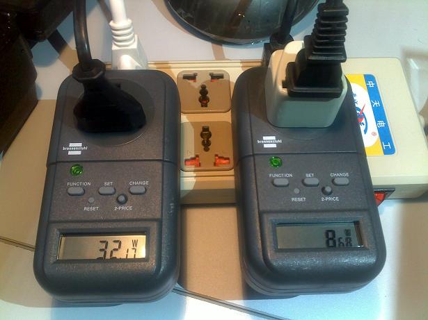 圖4.左邊為鹵素台燈的能耗為32.17W,右邊為LED燈的能耗為8.68W