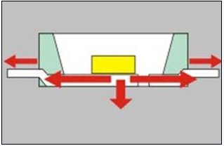 采用台灣琉明斯的專利結構的LED燈(deng)珠(zhu),其(qi)芯(xin)片(pian)放(fang)置(zhi)於(yu)接(jie)腳(jiao)上(shang),熱(re)能(neng)過(guo)銀(yin)腳(jiao)直(zhi)接(jie)將(jiang)芯(xin)片(pian)節(jie)點(dian)所(suo)產(chan)生(sheng)的(de)熱(re)帶(dai)出(chu)來(lai),同(tong)傳(chuan)統(tong)的(de)直(zhi)插(cha)產(chan)品(pin),及(ji)傳(chuan)統(tong)的(de)貼(tie)片(pian)產(chan)品(pin)在(zai)散(san)熱(re)方(fang)麵(mian)有(you)質(zhi)的(de)不(bu)同(tong),芯(xin)片(pian)的(de)節(jie)點(dian)溫(wen)度(du)不(bu)會(hui)產(chan)生(sheng)累(lei)積(ji),從(cong)而(er)保(bao)證(zheng)了(le)光(guang)源(yuan)燈(deng)珠(zhu)的(de)良(liang)好(hao)使(shi)用(yong)性(xing),保(bao)證(zheng)光(guang)源(yuan)燈(deng)珠(zhu)的(de)長(chang)壽(shou)命(ming),低(di)光(guang)衰(shuai)。