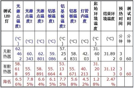 熱傳導的途徑有三種,對流、傳導及輻射。在封閉的環境中,對流及傳導實現的可能較小,而通過輻射將熱散發出來,是日光燈管考慮的重點。以下是我們做的LED日光燈管的測試數據,在LED銀腳焊點外測出的溫度才58度。