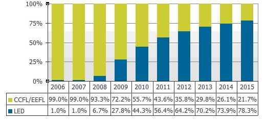 2006-2015采用傳統CCFL&EEFL燈管與LED背光大尺寸液晶麵板出貨比率預測