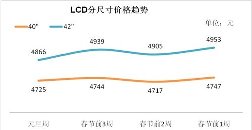 元旦到春節前的旺季內不僅城市市場有很強的爆發力,而且村鎮市場的需求量將會得到極大的釋放。所以,從元旦到春節前連續6周的市場旺季整體市場的均價將會有一定的波動。以40英寸和42英寸液晶電視為例來看,價格將呈現小幅周度波動的變化。(詳見下圖)