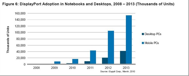 圖為iSuppli公司對於2008-2013年DisplayPort在筆記本電腦和台式電腦中的占有率的預測。
