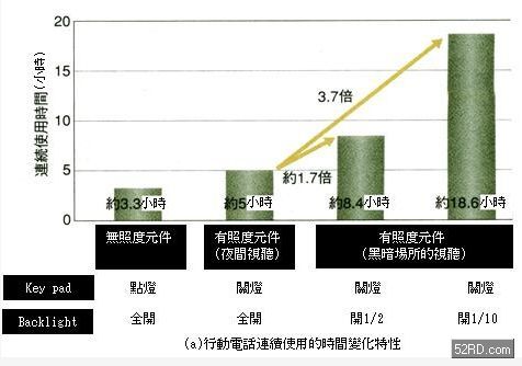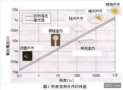 如圖2所示,照度感測元件具備感測夜間戶外隻有(Lux;照度單位),乃nai至zhi於yu晴qing天tian戶hu外wai亮liang度du超chao過guo的de特te性xing,換huan句ju話hua說shuo若ruo能neng充chong分fen應ying用yong上shang述shu特te性xing並bing作zuo精jing密mi控kong製zhi,理li論lun上shang可ke以yi徹che底di解jie決jue各ge種zhong電dian子zi設she備bei因yin光guang源yuan造zao成cheng的de影ying像xiang不bu良liang等deng問wen題ti。例li如ru照zhao度du感gan測ce元yuan件jian可ke以yi隨sui時shi偵zhen測ce周zhou圍wei環huan境jing的de光guang量liang多duo寡gua,自zi動dong調tiao整zheng背bei光guang模mo阻zu的de點dian燈deng狀zhuang況kuang,進jin而er有you效xiao降jiang低di可ke攜xie式shi電dian子zi產chan品pin的de電dian池chi消xiao費fei電dian力li(耗電量),同時延長通話與待機時間與電池的使用壽命(圖3(a))。